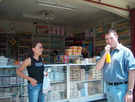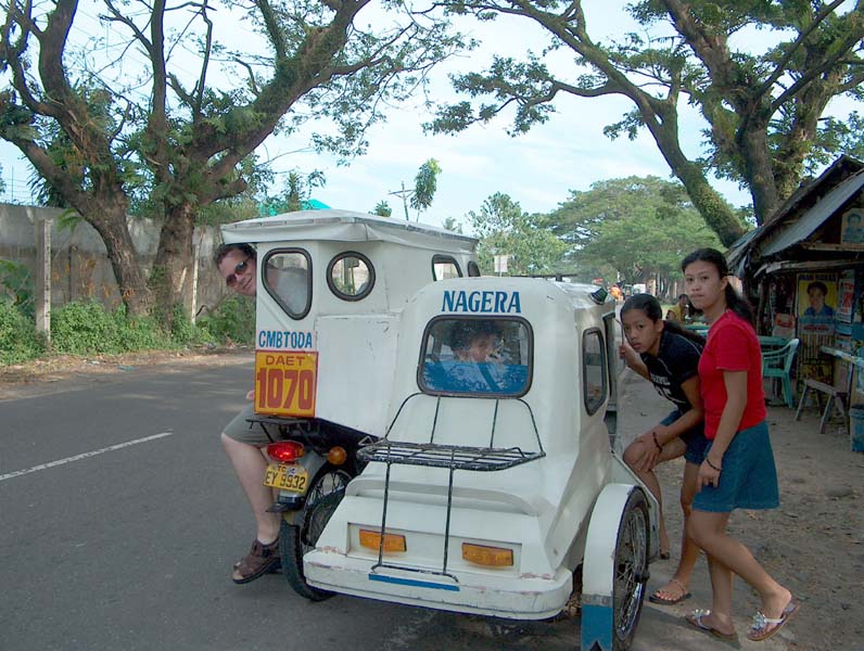The principal means of getting around are the tricycles: motorcycles with sidecars. It costs 5 pesos a ride (10 cents) and we've seen some where they crowd 5 people into them (some people ride on the roof).